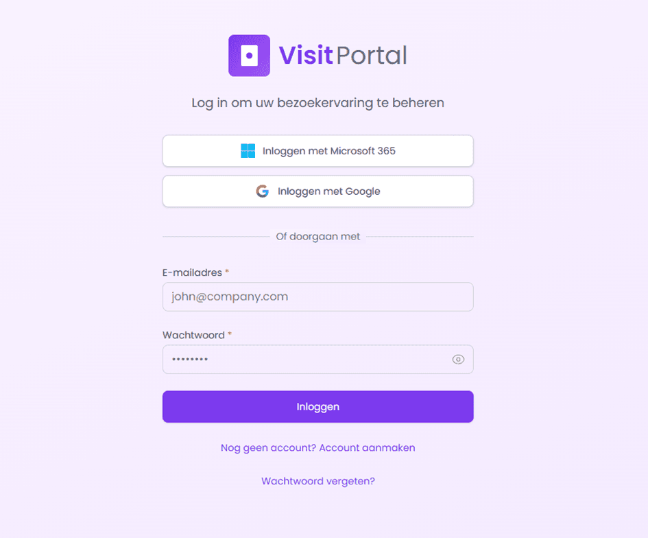 Heb je geen Microsoft 365 of Google Workspace account, dan kan je kiezen voor “Account aanmaken”. Hierbij gebruik je verplicht een zakelijk e-mailadres. Visit Portal is een B2B applicatie en ondersteunt geen persoonlijke e-mailadressen zoals Gmail, Hotmail of Outlook.com.