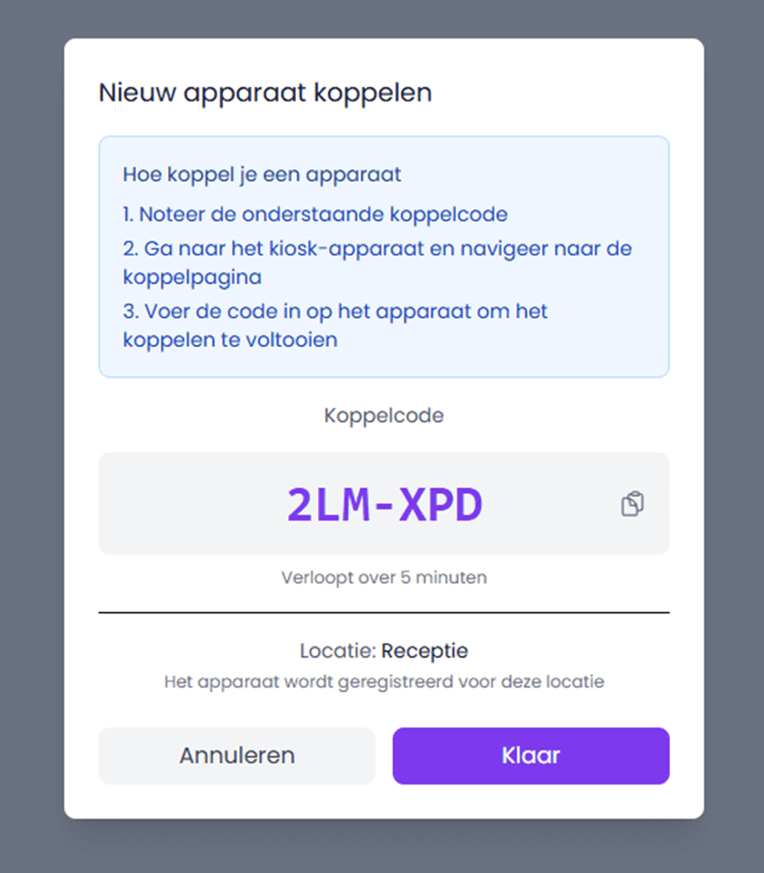 Bij het openen van de kiosk wordt gevraagd om het apparaat te koppelen aan je account.