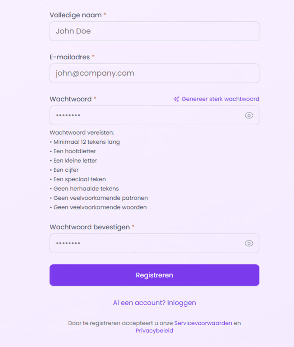 Bij het aanmaken van een nieuw account geef je je naam, e-mailadres en wachtwoord op. Beveiliging is een belangrijk aandachtspunt binnen Visit Portal. Daarom verwachten we een sterk wachtwoord. Om dit eenvoudig te maken, is er een ingebouwde wachtwoordgenerator voorzien. We raden aan om je wachtwoord veilig op te slaan in een paswoordkluis.