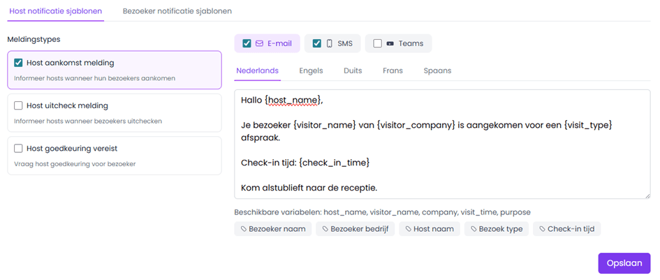 Zodra je gastpersonen zijn ingesteld, kan je meldingen configureren. Visit Portal ondersteunt verschillende meldingsvormen die je volledig zelf kan aanpassen.